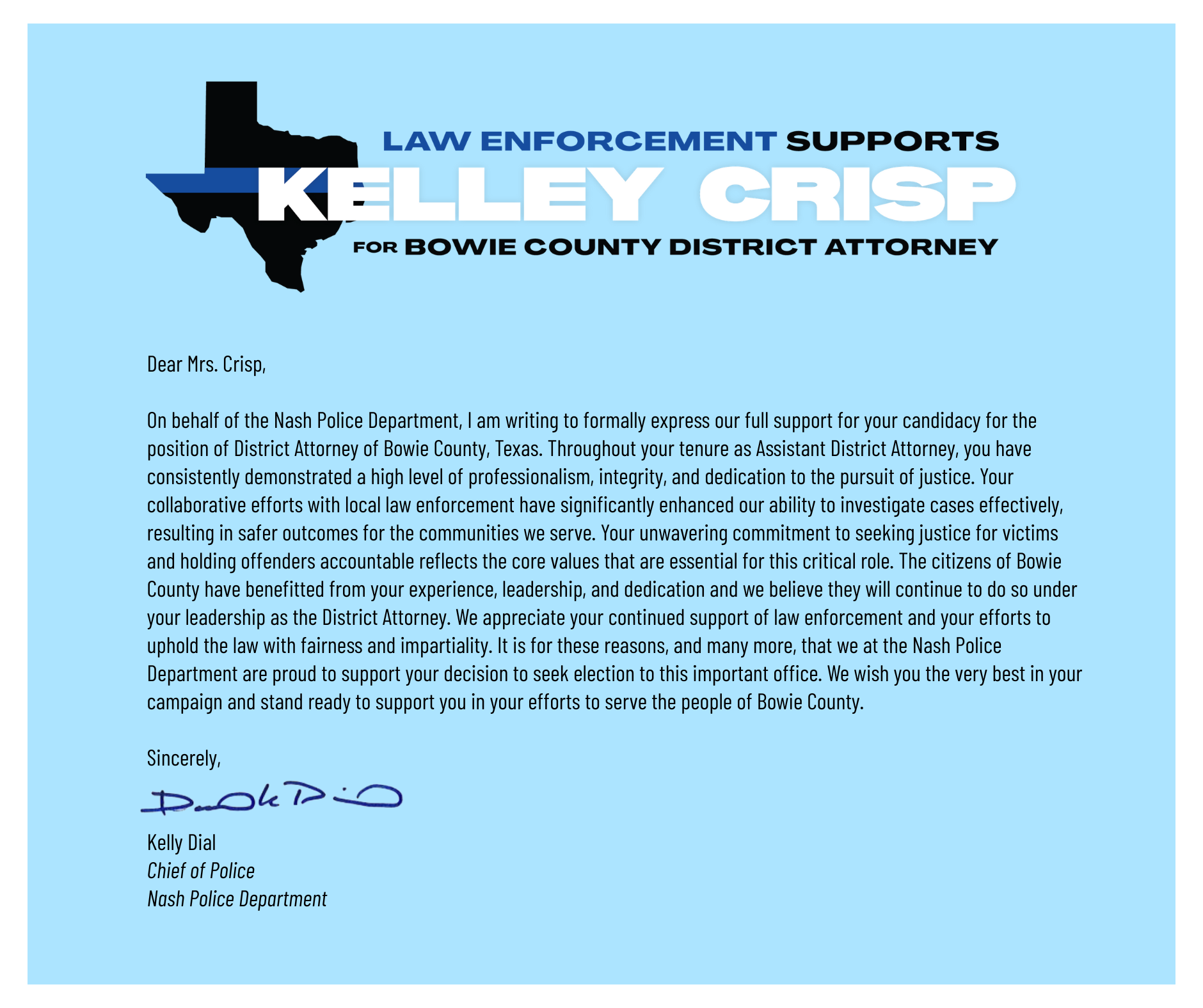 “Law enforcement works alongside Kelley Crisp every day,” said Bowie County Sheriff Jeff Neal. “From investigating to prosecutions, we depend on Kelley to get justice in our courts of law, and she has never let us down.”